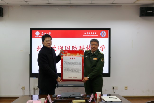 随后,冯海涛大校详细介绍了国防科技大学信息通信学院的历史沿革、学科建设、人才培养体系以及研究生招生政策。他表示期待与学校携手深化合作,共筑“校际联动、资源共享”的人才培养新生态,为科技强国与数字经济发展贡献更大力量。冯海涛代表国防科技大学信息通信学院向学校、学院赠送“感谢信”,沈纲祥院长代表学院接受“感谢信”,双方合影留念。